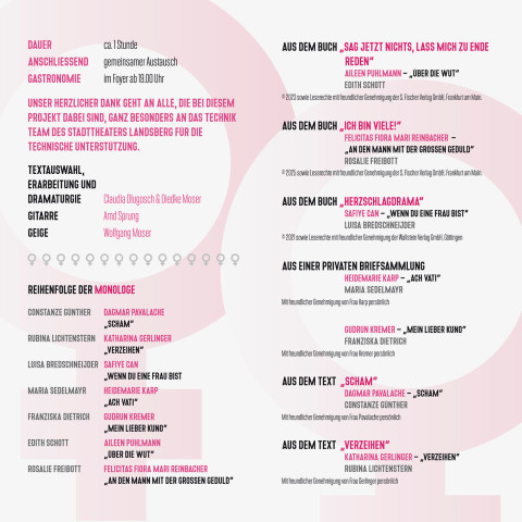 Die Monologe behandeln daher auch verschiedenartige Themen die Frauen jeden Alters betreffen können, u.a. aus „Aber jetzt ist Schluss, neue ungehaltene Reden ungehaltener Frauen“. Besonders freuen wir uns, Vortragsrechte von Frauen erhalten zu haben und aus ganz persönlichen Briefen vortragen zu können.